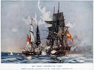 ![]() La acción y captura de la fragata jabeque española El Gamo, de Charles Edward Dixon | ||||