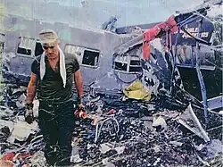 ![]() Un rescatista y dos vagones completamente destruidos por el impacto. | ||