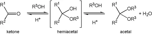 La reacción está en equilibrio marcado, así que se utilizan condiciones que favorezcan la formación del producto acetálico, por ejemplo, haciendo uso de la ley de acción de masas. El mecanismo de formación de acetales se cataliza con medio ácido. Esta reacción es en dos etapas, llevadas a cabo en el mismo reactor. En la primera, el compuesto carbonílico reacciona con una cantidad equivalente de alcohol, en un equilibrio ácido-base por un mecanismo de adición-eliminación para formar un hemiacetal (o hemicetal, según sea aldehído o cetona). El hemiacetal se protona posteriormente para formar el acetal otra vez por un mecanismo adición-eliminación.