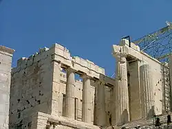 Los propileos eran la gran entrada a la Acrópolis de Atenas. Fueron construidos a partir del año 437 a. C. por el arquitecto Mnesicles en un terreno accidentado y sobre las ruinas de los propileos arcaicos que fueron destruidos en el año 480 a. C. en el incendio ocasionado por los persas.[30] Las seis columnas de la entrada son dóricas, igual las de la fachada delantera como las seis de la parte posterior. Está construido con mármol pentélico, consta de un vestíbulo de 24 x 18 metros. En el interior, un muro con cinco puertas lo divide en dos partes; la occidental, más grande, tiene dos hileras de tres columnas jónicas que forman tres naves.[31]