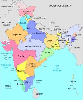 - Kerala: formado por la fusión del estado de Travancore-Cochín con el distrito de Malabar del estado de Madrás y Kasaragod del distrito de Canara del Sur. El distrito de Kanyakumari ubicado en la parte sur del estado de Travancore-Cochín, fue transferido al estado de Madrás.