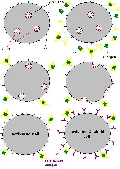 Las células desgranuladas exponen moléculas CD63[2] en su membrana celular externa, por lo tanto, los gránulos, que contienen moléculas CD63 en su superficie interna, se fusionaron con la membrana celular. La superficie celular interna de los gránulos se convierte en la superficie celular externa de los basófilos/mastocitos durante el proceso de desgranulación.