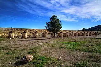 La Real Acequia de Alcalá, de origen árabe, fue renovada entre los años 1785 y 1791 debido a la construcción de los pantanos de Puentes y Valdeinfierno. Es en esta época cuando se construye el acueducto que sustituye a uno precedente de veintinueve arcos, que regularmente experimentaba fuertes deterioros causados por las fuertes avenidas.[2]