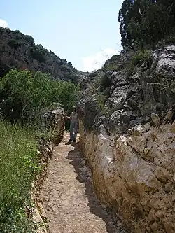 El último tramo del acueducto, descubierto en gran parte, está formado por un canal en abierto excavado en la roca, con mayor pendiente, con una profundidad de un metro y una anchura de 0,60 metros.[1]