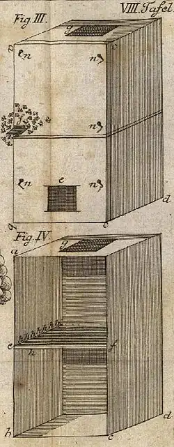 Schirach es un apicultor activo secretario permanente de la Organización Bienengesellschaft em Oberlausitz, fundada en 1766. Muchas de las láminas de Oekonomische Encyklopädie de 1774, fueron tomadas de la obra de Schirach, quien diferenciaba perfectamente castas, tipos de colmenas y elementos necesarios para la práctica de la apicultura. Las colmena de panales móviles, colmena vertical y la colmena horizontal son reproducidas en este dibujo, véase el dibujo prestando mucha atención a los travesaños entre la primera y segunda alza, aunque la exposición de los panales parecería ser en fría respecto a la piquera. Es posible que las alzas se abrieran lateralmente de manera exclusiva.