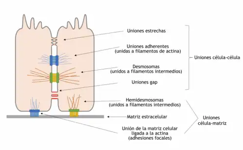En los organismos pluricelulares, las uniones entre las CAM permiten que las células se adhieran entre sí y crean estructuras denominadas uniones celulares. Según sus funciones, las uniones celulares pueden clasificarse en:[2]