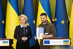 - ↑ «Obtaining Ukraine's EU membership candidate status is of great importance for the Ukrainian people - President during a conversation with Ursula von der Leyen». 9 de mayo de 2022. Consultado el 10 de mayo de 2022.