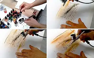 La aerografía es una técnica artística que requiere de un cierto grado de entrenamiento, para ello se utiliza una fuente de aíre a presión positiva, mangueras neumáticas, compresor, proporcionando aire por Efecto Venturi sobre un aerógrafo que mezcla aire y pigmento prediluido en un solvente que lo proyecta en forma atomizada.