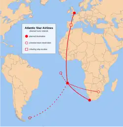 En junio de 2013 de Atlantic Star Airlines, que fue constituida en Inglaterra y Gales el 20 de noviembre de 2012,[24] anunció que haría una oferta por el contrato para volar a Santa Elena cuando el aeropuerto abra en 2016.[25] Se planea explotar una ruta que operará desde el Reino Unido (haciendo una escala en Madrid para cargar combustible), pase por la isla y luego a Ciudad del Cabo usado aviones Boeing 757. Agregando una ruta más a Johannesburgo en un plazo relativamente corto, así como las conexiones aéreas con menos frecuencia a la isla Ascensión y las Islas Malvinas también están bajo consideración.[19][26] En este último territorio, reclamado por Argentina, los vuelos partirían desde la Base Aérea de Monte Agradable.[27]