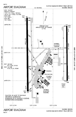 - Información del Aeropuerto de Eugene en AirNav (en inglés)