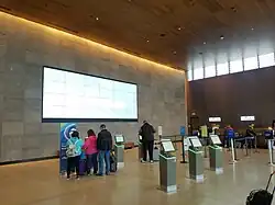El vestíbulo también tiene una vitrina con recuerdos de aviación que representan la historia de Paine Field, Alaska Airlines y United Airlines; se instalan obras de arte públicas adicionales en el estacionamiento y fuera del edificio, incluida una estatua de Topliff Olin Paine. La terminal también cuenta con servicio de estacionamiento, áreas de entrega en la acera y una parada de taxis/paradas de taxis.[12]