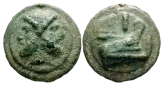 Aes grave: Sextans, 217–215 a. C. En el anverso, la cabeza del dios Mercurio; en el reverso, la proa de un barco (prora).