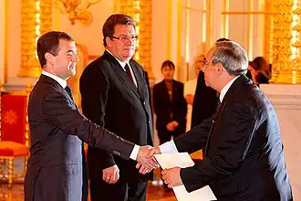 ![]() Safieh presentando sus credenciales a Dmitri Medvédev | ||
