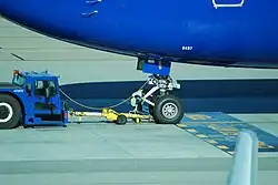 - Push-back: Remolque a la calle de rodaje con un tractor y la dirección de la misma mediante un cable de comunicación a la cabina, colocación de pins en el tren delantero.