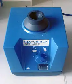 Un agitador tipo vórtex o mezclador de vórtice es un dispositivo simple que se usa comúnmente en los laboratorios para agitar pequeños tubos o frascos de líquido. Se compone de un motor eléctrico con el eje de transmisión orientado verticalmente y unido a un trozo de goma o caucho montado en forma de copa, ligeramente excéntrico. A medida que el motor gira la pieza de caucho oscila rápidamente en un movimiento circular. Cuando un tubo de ensayo o recipiente adecuado se coloca en el soporte de goma (o toca su borde) el movimiento se transmite al líquido en su interior y se crea un vórtice. La mayoría de los mezcladores de vórtice tienen una configuración de velocidad variable y pueden ser configurados para ejecutarse de forma continua, o para que funcione sólo cuando una débil presión se aplica a la goma. Poseen unos pies de ventosa en la base para evitar desplazamientos.