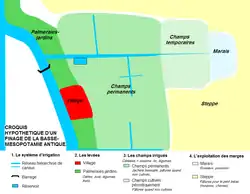 En las áreas de la agricultura de regadío del sur, las ciudades parecen más bien establecidas en las riberas de los ríos o de los principales canales naturales, donde los sedimentos habían dado lugar a una elevación del nivel del suelo (lo que limita el riesgo de inundación). Los huertos de palmeras y también los canales circundan los canales, cerca de las aldeas o de los alrededores de las ciudades; En Uruk durante el período neo-babilónico, las parcelas de palmeras son muy alargadas, su lado más largo bordeando los ríos. Al alejarse de las aldeas hacia los límites de las tierras de regadío hacia la zona árida, la red de canales se va reduciendo, y la calidad de la tierra disminuye. El espacio sin cultivar se utiliza para el pastoreo de animales. Los límites de las tierras de regadío también pueden estar marcados por los pantanos, que sirven como espacio para la pesca y la caza o el suministro de cañas (especialmente en el extremo sur de Mesopotamia). Se encuentran hábitats aislados. El reparto del espacio entre las tierras de regadío, desierto y pantanos no era estático; algunos campos se convirtieron en zonas incultas debido a una excesiva concentración de sales en el suelo, y por lo tanto se desertificaron, mientras que por el contrario, una zona desértica se podía mejorar mediante el riego; de la misma manera, los humedales podían ser drenados.