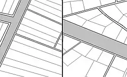 Los campos de los territorios irrigados debían tener un acceso directo a un canal. Como resultado, la competencia por el acceso al agua redujo el ancho de los campos para permitir que un mayor número de ellos tuvieran acceso al canal y se consiguió un área más amplia alargando la longitud del campo. Las parcelas son aproximadamente rectangulares, mucho más largas que anchas, resultando en un paisaje de campos «tablilla de parqué». Según M. Liverani.[1] este es el tipo de campo en el país de Sumeria. Más al norte en el país de Akkad, los campos eran más recogidos, al menos, hasta el I milenio, cuando parece que los campos de Babilonia se hacen más alargados. Según el mismo autor, este tipo de campo es el resultado de una planificación, con el fin de optimizar el uso del espacio, permitiendo un máximo de campos con acceso a los canales (y por lo tanto la extensión de este tipo de paisaje fue debida a la voluntad de las autoridades de los principales organismos).
