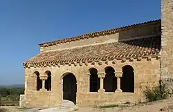 El templo data de mediados del siglo XII y cuenta con una sola nave cubierta con armadura de madera que acaba en ábside semicircular. La galería aneja se sustenta en columnas con basa sobre altos podios y está construida en sillería, a diferencia del resto del edificio, que se levantó en mampostería. La portada, muy abocinada, tiene cuatro arquivoltas, tres de ellas apoyadas en columnas con capiteles decorados