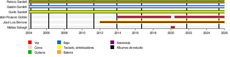 La agrupación cuenta con el cantante y guitarrista principal Patricio Sardelli, el guitarrista rítmico y cantante Guido Sardelli, el bajista Gastón Sardelli, el tecladista José Luis Berrone y el baterista Sebastián Roascio Goldar.