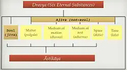 De estas, las cuatro primeras se describen como el asti-kaia dravia (sustancias que poseen elementos constitutivos y se extienden en el espacio), mientras que la quinta categoría (el tiempo) es una anasti-kaia dravia (que no tiene extensión en el espacio).[2]