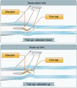 El ajuste del estabilizador libera al piloto de ejercer una fuerza constante sobre los controles de inclinación, ajustando el control de ajuste (a menudo en forma de rueda vertical) para cancelar las fuerzas de control para una determinada velocidad aerodinámica y distribución del peso.[8] Normalmente, cuando se gira esta rueda hacia arriba (o se levanta la palanca), la nariz del avión se inclina hacia abajo; al girarla hacia abajo (o presionar la palanca) baja el estabilizador de la cola y se eleva la nariz del avión.[7][8][10]