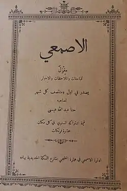 Al-Asma'i (en árabe: الأصمعي) fue una revista quincenal literaria y política árabe de corta duración publicada en 1908 y 1909 en Palestina, entonces parte del Imperio otomano . La revista fue una de las primeras publicaciones que surgieron en Palestina tras el levantamiento de la censura de prensa.[1] Fue impreso y distribuido en Jerusalén, mientras que la sede y oficinas de la revista estaban en Jaffa.[2]