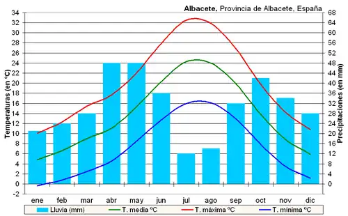 De acuerdo con la clasificación climática de Köppen, el clima de Albacete es un clima semiárido de tipo BSk. Sin embargo, se podría considerar también como un clima mediterráneo seco por su mínimo marcado de precipitaciones en verano, y con ciertos rasgos continentales debido a la altitud y a la relativa lejanía al mar, lo que produce una mayor amplitud térmica anual. La pluviometría es escasa y la temperatura presenta grandes variaciones, tanto entre estaciones como a lo largo del día.[39] Albacete alcanzó los -19 °C el 14 de febrero de 1983, siendo ese mes uno de los más fríos desde que se recogen datos meteorológicos, con 14 días con temperaturas mínimas bajo cero y registrando también -17 °C el día 13, -13 °C el día 16 y -14 °C el día 17. Destacar también que Albacete registró -16 °C el 29 de enero de 2006 y -9 °C el 16 de diciembre. La estación meteorológica de la base aérea de Albacete registró el 3 de enero de 1971 una temperatura mínima de -24,0 °C, la más baja registrada en una capital provincial española. La temperatura máxima récord está en los 43.3 °C del 14 de agosto de 2021. Los datos de la siguiente tabla son medias del periodo comprendido entre 1981 y 2010:[42]