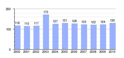 | Gráfica de evolución demográfica de Aldaz entre 2000 y 2010 |