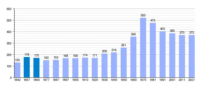 | Gráfica de evolución demográfica de Aldehuela del Jerte[7] entre 1842 y 2021 |