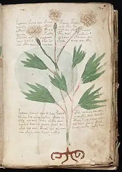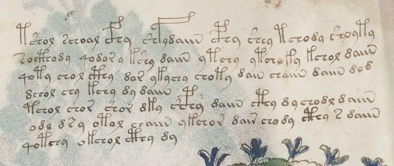 A continuación se muestra un fragmento del manuscrito Voynich, más específicamente del f11r (sección herbaria), junto con una representación del mismo texto en una fuente tipográfica que imita los caracteres del manuscrito y la transcripción al alfabeto latino utilizando EVA: