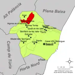 Situado al noroeste de la comarca del Camp de Morvedre, en el valle del río Palancia. El río divide el término en dos mitades, quedando el núcleo urbano a la derecha. Las montañas más elevadas del término municipal son el Picaio (388 m.), la Costera (261 m.) y la llamada popularmente Montañeta de la Ermita (229 m), a cuyos pies se extienden las casas del pueblo. El clima es mediterráneo. La zona montañosa del término (365 ha) está cubierta de pinos, de propiedad municipal; hay también tomillo, romero y algo de esparto.