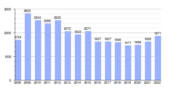 | Gráfica de evolución demográfica de Alhama de Granada[8] entre 1842 y 2021 |