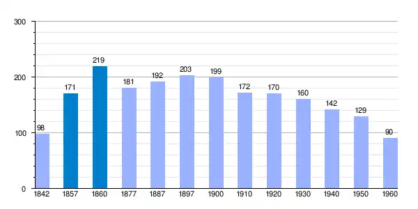 | Gráfica de evolución demográfica de Almaraz de la Mota[6] entre 1842 y 1960 |