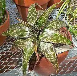 Es una planta suculenta sin tallo, solitaria o formando pequeños grupos. las hojas agrupadas en una roseta basal son carnosas, largas y estrechas de color verde oscuro brillante con numerosas manchas blancas alargadas y los márgenes con dientes triangulares de color marrón oscuro, de 1,5 mm de largo, 5 mm. La inflorescencia es simple, de 40 cm de altura; en forma de racimos cilíndricos, de 15 cm de largo, laxa; con brácteas y pedicelos de 6-8 mm de largo. Las flores de color rosa rojizo, colgantes.[2][3]