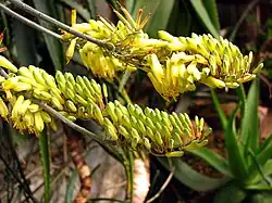 Es una planta suculenta erecta con las hojas de color verdes, manchadas de blanco, de 70 x 12 cm, lisas, con márgenes dentados prominentes. Las inflorescencias con un máximo de tres ramas, alcanza los 175 cm de altura; en forma de racimos cónicos, bastante densos, con brácteas de 10 mm de largo, pedicelos de 6-8 mm de largo. Las flores de color rojo o amarillo, el perianto cilíndrico, un poco curvado.[2][3]