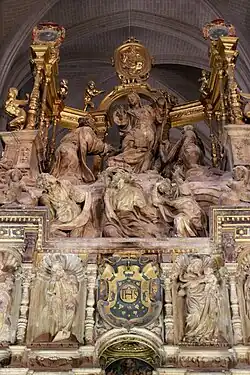 En relación con el modelo es posible, con todo, establecer algunas diferencias: sin el sentido arquitectónico y decorativo de Ordóñez, desaparece la estructura de columnas y nichos. Las imágenes y escenas de las paredes del sarcófago —la Caridad y la imposición de la casulla a san Ildefonso en los frentes, y escenas de la vida del Bautista y de la leyenda de Santiago en los laterales— surgen directamente de la piedra desbordando los marcos de los tondos e invadiendo el espacio de la escena contigua. En las esquinas, en lugar de los Padres de la Iglesia latina del sarcófago de Cisneros, están representadas en cuatro elegantes bultos las virtudes cardinales, con recuerdos de la estatuaria clásica.[79] El bulto del yacente es, en fin, la imagen sin disimulo de un cadáver, para la que se habría servido de la mascarilla mortuoria en cera, con un original y antitradicional naturalismo extremo.[80][81]