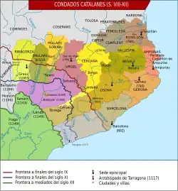 Los condados catalanes fueron fundados en el siglo IX por la monarquía franca en la vertiente sudoriental de los Pirineos para prevenir las posibles incursiones de los musulmanes de al-Ándalus. En el año 785 los francos se habían apoderado de la ciudad de Gerona y en el 801 de la de Barcelona. Aunque siguieron reconociendo la autoridad formal del monarca franco, los condes pronto se hicieron independientes, al conseguir que su nombramiento fuera vitalicio y hereditario. Sin embargo, se mantuvo la fragmentación, lo que dificultó el nacimiento de una entidad territorial y política, aunque pronto el condado de Barcelona se convirtió en hegemónico. El conde Ramón Berenguer I (1035-1076), además de reunir junto al de Barcelona, los condados de Gerona y Osona, consiguió que el resto de condes fueran sus vasallos y le juraran fidelidad.[117][102][118][119][120]