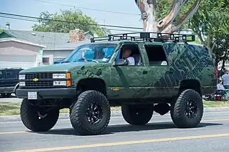 Chevrolet Suburban con ruedas especiales y modificaciones en la suspensión para elevar la corrocería. Nótese una distancia al suelo mucho mayor debajo del eje delantero (con suspensión independiente), si se compara con el espacio libre disponible bajo el diferencial del eje vivo en la parte trasera
