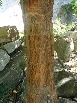 Es un árbol caducifolio, de gran desarrollo, 15-25 (ocasionalmente 35) m de altura de fuste recto de 5-13 dm de diámetro, corteza castaño anaranjada, lisa, se desprende en escamas papiláceas; copa aplanada, follaje verde oscuro; hojas alternas, pinnadas, 8-22 cm de largo, 7-12 foliolos elípticos, alternos, 3-5 cm × 2-3 cm