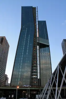 Las fachadas norte y sur del edificio están revestidas de cobre, mientras que las este y oeste son de vidrio desde el piso piso hasta el techo. El diseño del conjunto busca dar la apariencia de que las torres bailan entre sí.[5] Están conectadas por un puente de aproximadamente 91,5 m del suelo, tres niveles de altura.[16] La torre oeste mide 164 m de altura y la este, 143 m.[1]