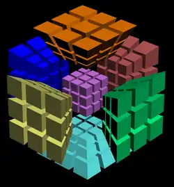 - Pegatina. Las etiquetas de colores en el rompecabezas que identifican el estado del mismo. Por ejemplo, los cubos de las esquinas de un cubo de Rubik son una sola pieza, pero cada uno tiene tres pegatinas de distintos colores. Las pegatinas en rompecabezas de mayor dimensión tendrán una dimensionalidad mayor que dos. Por ejemplo, en el cubo de 4, las pegatinas son sólidos tridimensionales.