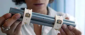 En espectrometría de masas, el analizador de masas cuadrupolo (o filtro de masas cuadrupolo ) es un tipo de analizador de masas concebido originalmente por el premio Nobel Wolfgang Paul y su alumno Helmut Steinwedel.[1] Como su nombre indica, consta de cuatro varillas cilíndricas paralelas entre sí. En un espectrómetro de masas cuadrupolar (EMC), el cuadrupolo es el analizador de masas, es decir, el componente del instrumento responsable de seleccionar los iones de la muestra en función de su relación masa/carga (m/z). Los iones se separan en un cuadrupolo en función de la estabilidad de sus trayectorias en los campos eléctricos oscilantes que se aplican a las varillas.[2]