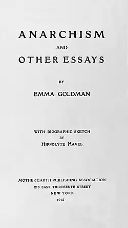| Anarchism and Other Essays, Anarchismus und andere Essays, Anarquisme i altres assaigs, Anarkiismo kaj aliaj eseoj, Anarquismo y otros ensayos, Anarquismo e Outros Ensaios, Анархізм ды іншыя эсэ, Anarkisme og andre essays, Anarquismo e outros ensaios, חמישה מאמרים פמיניסטיים, Անարխիզմ և այլ էսսեներ, アナキズムとその他エッセイ, Анархізм та інші есе, 无政府主义及其他, Anarşizm Neyi Savunur?, Anarchizm i inne eseje, Anarkismi ja muita esseitä, Anarchizmas ir kitos esė, Anarhizam i drugi ogledi y Анархизм | |||||