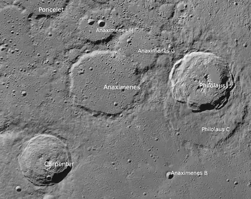 Anaximenes (Anaxímenes en español) es un cráter de impacto de borde bajo, situado cerca del limbo norte-noroeste de la Luna. Yace al oeste del cráter Philolaus y al noreste de Carpenter. Al noroeste se halla Poncelet, cerca del límite de la superficie de la Luna visible desde la Tierra.