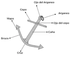 - Victorio R. Gómez. Arte de la maniobra del buque (teoría y práctica). Centro de Capitanes de Ultramar y oficiales de la Marina Mercante. Buenos Aires, 1985. ISBN 950-9016-42-7 (pág. 286) (despiece de ancla).