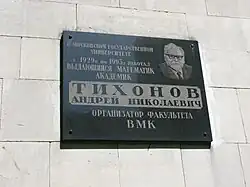 Placa en honor de Tíjonov en la Universidad Estatal de Moscú, en el edificio donde está situada la Facultad de cibernética y matemáticas computacionales