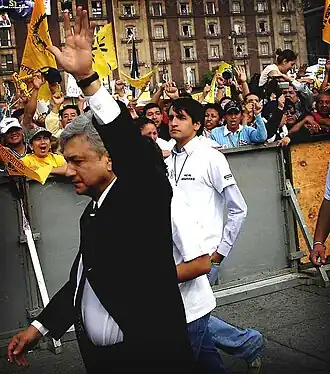 Después se convirtió en una figura crítica de este último, realizó una estrategia de divulgación de su proyecto político al recorrer la totalidad de los municipios del país. Esto lo llevó a constituir en 2011 una asociación civil (Movimiento de Regeneración Nacional) que respaldara su candidatura y movilizara a la gente en pos de una eventual defensa del voto. Fue candidato por la coalición Movimiento Progresista en las elecciones presidenciales de 2012, sin embargo, y con un impacto menor de la elección anterior, en esta ocasión las acusaciones de irregularidades se centraron en la compra masiva de votos y el uso ilegal de recursos económicos o mediáticos en favor de Enrique Peña Nieto. Posteriormente sería presidente del partido Morena de 2015 a 2017. Sus elevados niveles de popularidad y el enfoque social de su proyecto, se conjuntaron con el descontento general provocado por la serie de problemáticas acarreadas en los últimos tres gobiernos (violencia y corrupción), para obtener su triunfo en las elecciones federales de 2018, como el candidato más votado en la historia. Postulado por la coalición Juntos Haremos Historia, conformada por Morena, el Partido del Trabajo (PT) y el Partido Encuentro Social (PES).[11][12][13][14][15][16][17][18][19][20] El énfasis de su discurso en temas como la corrupción o la distribución de la riqueza, utilizando una «retórica de la indignación» y en detrimento de otros asuntos, ha motivado —entre otras razones— que lo cataloguen de populista por algunos analistas políticos.[21][22][23]