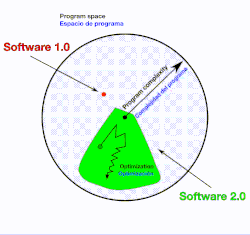 En cambio, en el Software 2.0 el enfoque es especificar algún objetivo sobre el comportamiento de un programa deseable (por ejemplo, «satisfacer un conjunto de datos de pares de entrada y salida de ejemplos», o «ganar un juego de Go»), escribir un esqueleto aproximado del código (es decir, una arquitectura de red neuronal) que identifica un subconjunto del espacio del programa para buscar y utilizar los recursos computacionales a nuestra disposición para buscar en este espacio un programa que funcione. En el caso de las redes neuronales, se restringe la búsqueda a un subconjunto continuo del espacio del programa donde el proceso de búsqueda se puede hacer (algo sorprendentemente) eficiente con retropropagación y descenso de gradiente estocástico.[28]