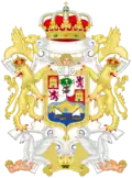 Escudo cortado: 1.º, de plata, una flor de lis azur; 2.º, de gules, una espuela de oro. Va timbrado con la corona real española.[27] |