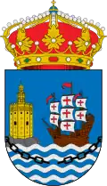 En campo de azur, una torre de oro almenada y mazonada, sobre unas rocas en su color natural y siniestrada de una nao de vela, también en su color natural, que con la proa ha roto una cadena de sable que sale desde la torre, todo sobre ondas de agua de plata y azur, puestas de punta. Timbrado con la corona real española.[29] De azur, a la diestra, una torre de oro sobre rocas al natural y a la siniestra, una nao de vela también de sus colores naturales que, con la proa, ha roto una cadena que sale de la torre, todo sobre ondas. El escudo se timbra con la corona real española. [30] |